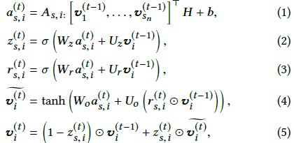 将每个节点转换到统一的embedding空间,最终得到每个item的d维度向量表示。这样就可以用item的embedding表示每个会话s,gnn产生节点表示能够将图拓扑做得很好,这样模型能够拟合复杂item连接。paper采用ggnn(门图网络)学习节点表示。网络更新规则: