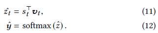 得到所有item的embedding和会话的embedding后,通过item embedding和会话embedding内积计算得到每个目标item的推荐分数。接下来,使用softmax得到最终的输出概率: