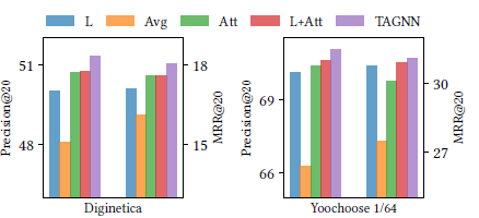 很显然,混合embedding策略是最佳的,也就是论文提出的方法。TAGNN-L仅仅用了最后一个item作为会话的表达,说明最后的item对用户最终的行为有很大影响。Avg是最差的,这就说明用户的行为是多样性的,不能平均。