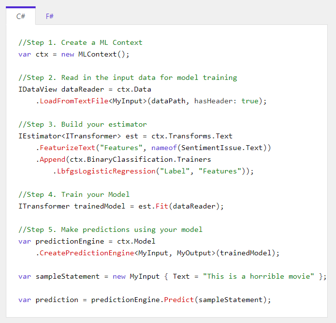 提起AI,大家都会先想到Python,确实Python作为一门好几十年的老语言,上一波的AI大流行使它焕发了青春。大家用Phtyon来做AI,最主要的原因无非就是编码量更少,很多数学和AI相关的Api都是现成的。但是随着ML.net的问世,我们现在可以在.netcore平台上使用比Python更少的代码来实现AI的功能了。