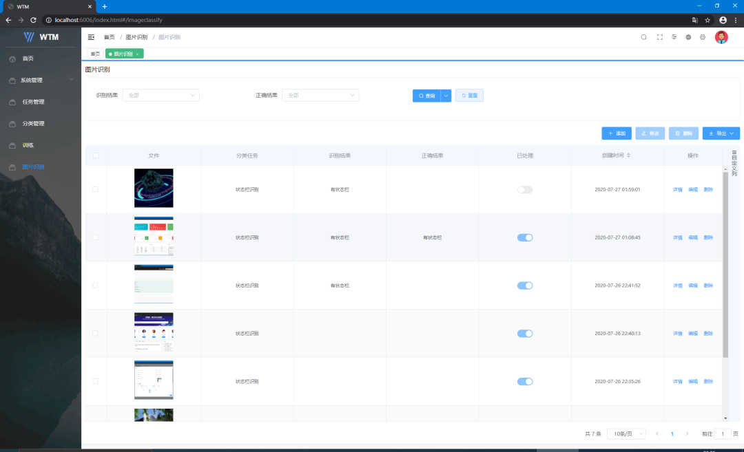 公司内部已有app需要增加一些额外功能,用户用手机截图上传的时候,系统需要判断图片有没有最上方的状态栏。由于手机本身系统的不同,再加上安卓手机状态栏基本上都能自定义,所以状态栏的样式是五花八门的,传统方式很难实现这个需求。最终我们使用WTM+ML.NET快速搭建了一个AI图片分类的平台,这个平台的功能包括: