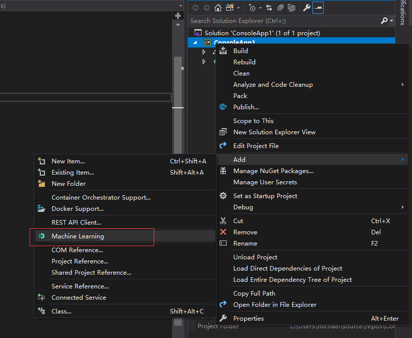 安装完毕之后,随便建一个.netcore的项目,控制台的就可以。右键点击添加就会看到ML.NET的选项