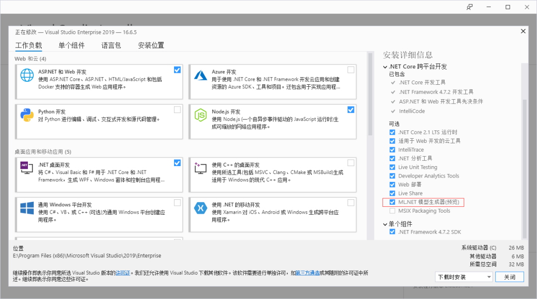 目前的Visual Studio 2019已经包含了ML.Net的图形化工具,只不过还是预览版,需要你手动开启,首先在Visual Studio Installer里安装的功能中勾选ML.Net
