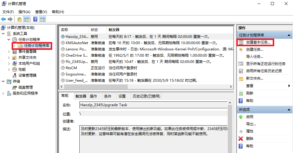 (1)此电脑-->右键点击“管理”-->进入计算机管理页面-->点击“任务计划程序”下拉的“任务计划程序库”-->点击“创建基本任务”;
