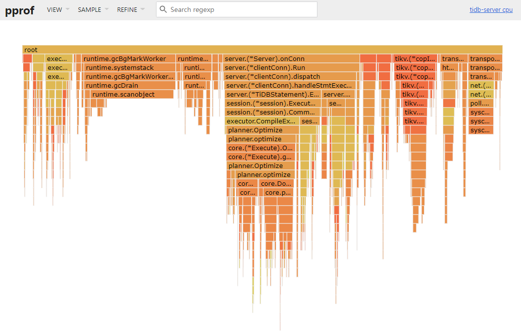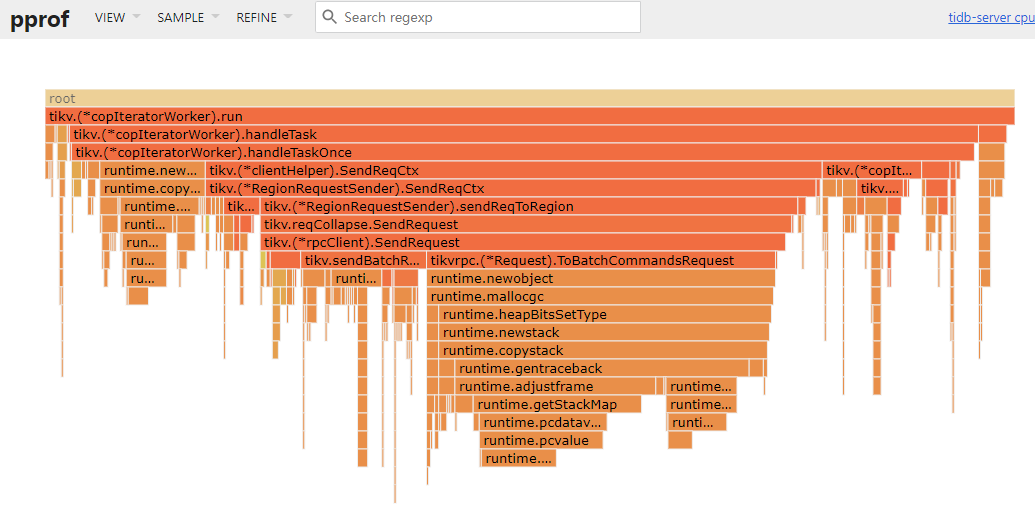 通过观察火焰图,我们发现,copIteratorWorker 占用了很大一部分时间,反推可以得到: