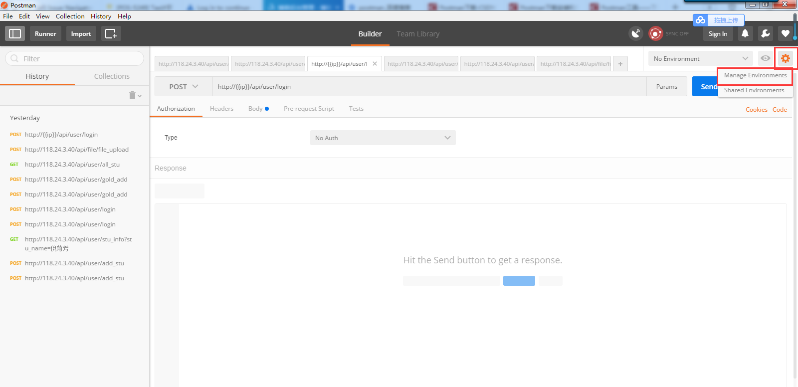 打开postman客户端,点击右上角的小齿轮按钮,在下拉菜单中选择第一个菜单,也就是Manage Enviroments