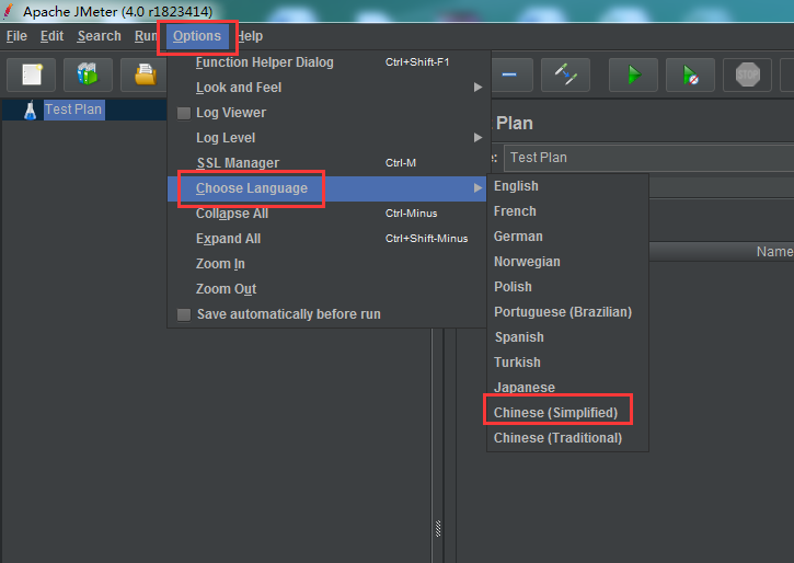 打开jmeter工具,在左上角的菜单中找到options,下拉选项中有个Choose Language是可以用来切界面换语言的