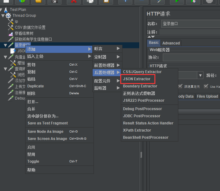 3)添加HTTP请求,也就是添加测试接口的用例,右击线程组后新建的接口测试用例就会属于这个线程组下面(后面会写到自定义变量的影响范围)