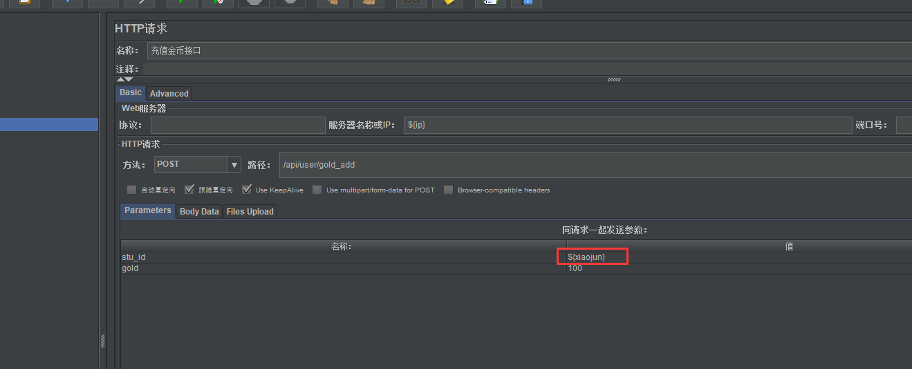 2)选择了接口类型后就需要将接口的测试地址输入至输入框,其中的ip地址可以直接输入也可以用全局变量,选择"Body"后输入接口文档中的传参,包括参数名和参数值