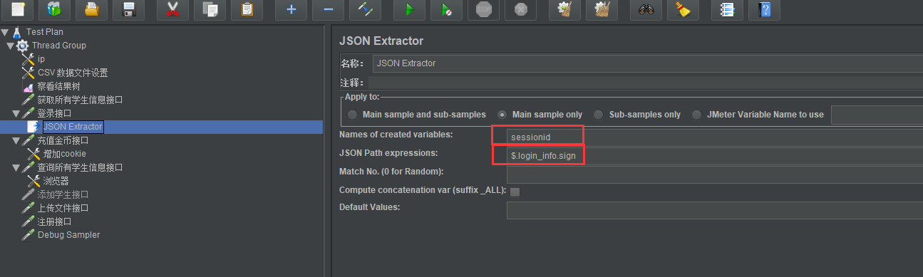 该变量中需要定义的是变量名:sessionid(这个随意取名,只要与后面调用它的地方保持一致便可),变量值是返回结果中的数据:示例中$.login_info.sign,sign是我们需要的值,而login_flogin_info是sign上一层级的参数名称,$则是最外层的参数
