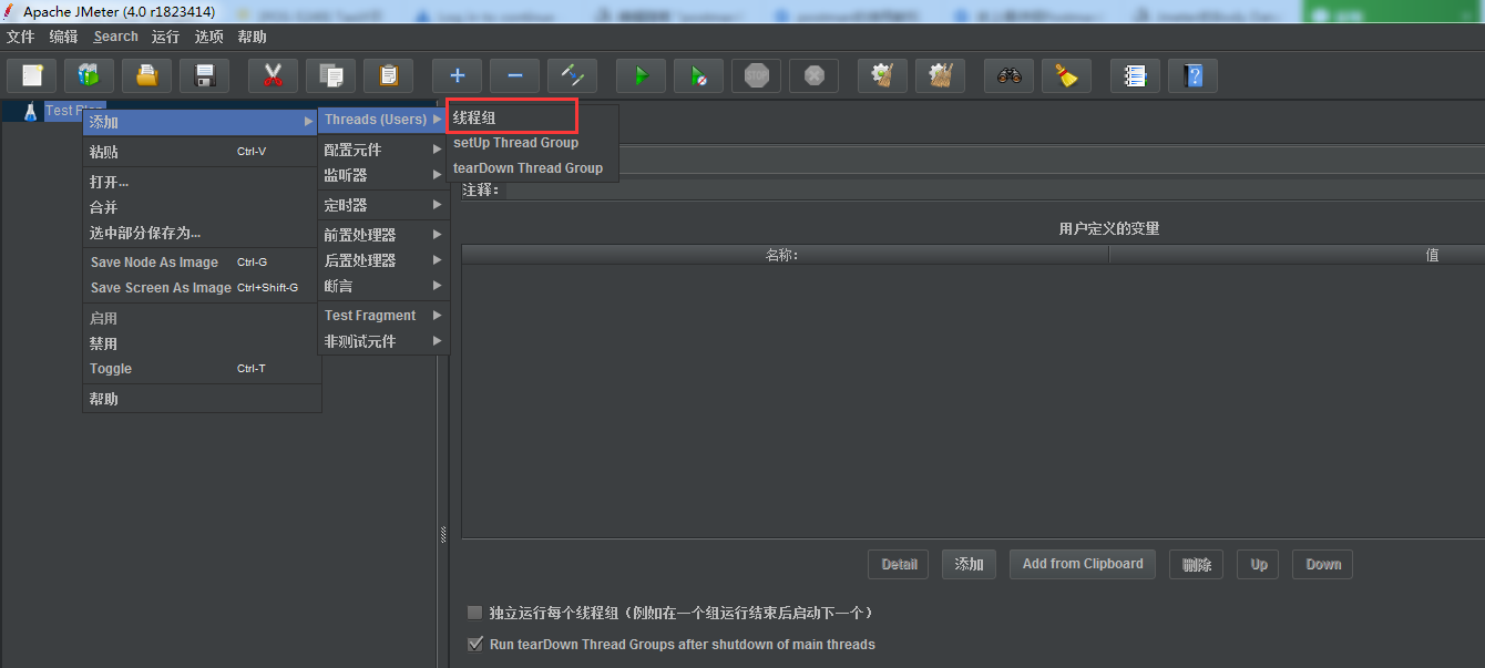 添加线程组相当于建一个队伍,然后一个项目下的接口都可以写在这个线程组下面,右击Test Plan