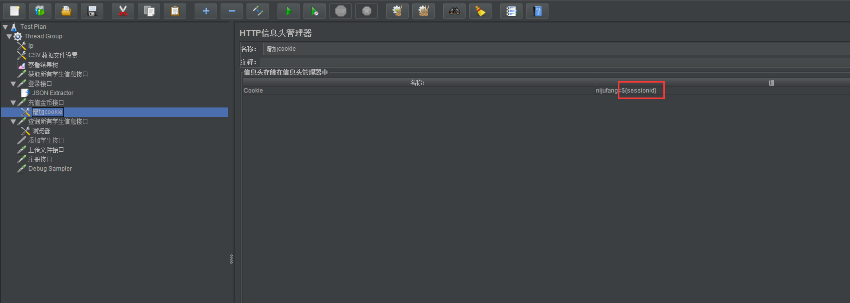 充值接口中添加的header参数cookie的值就可以直接写刚才定义好的参数即可