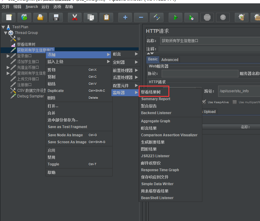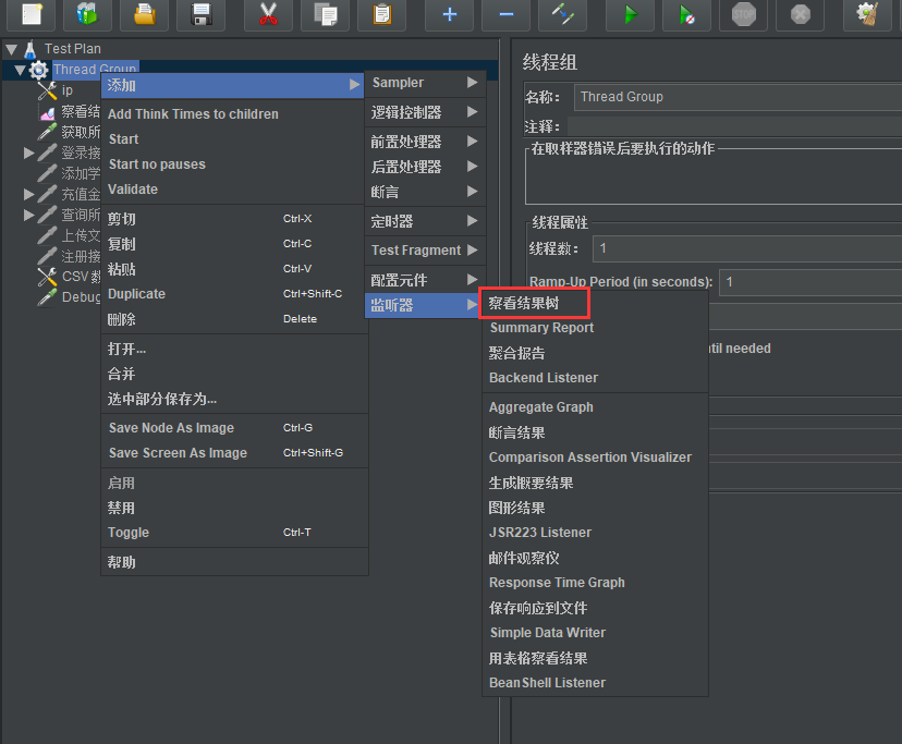 5)添加查看结果树,接口调用后我们需要查看返回结果,这个时候就需要添加查看结果树。右键线程组或者右键某一个http请求都可以添加查看结果树,两者的区别在于影响范围,前者是在该线程组下运行的接口结果都可以查看,而后者只能查看单个接口返回的结果