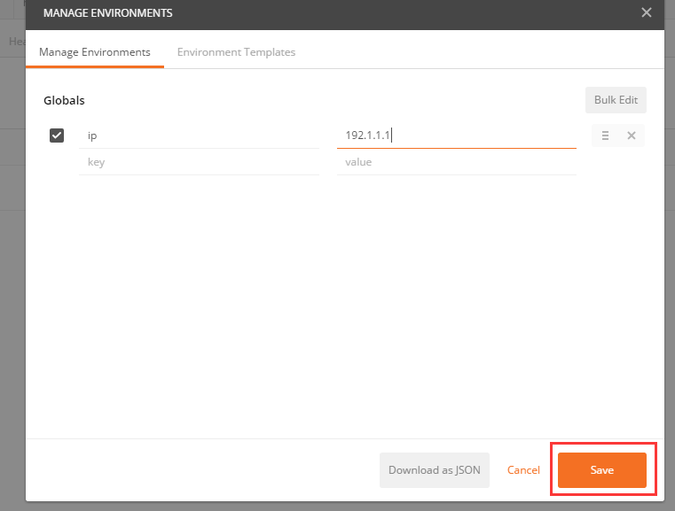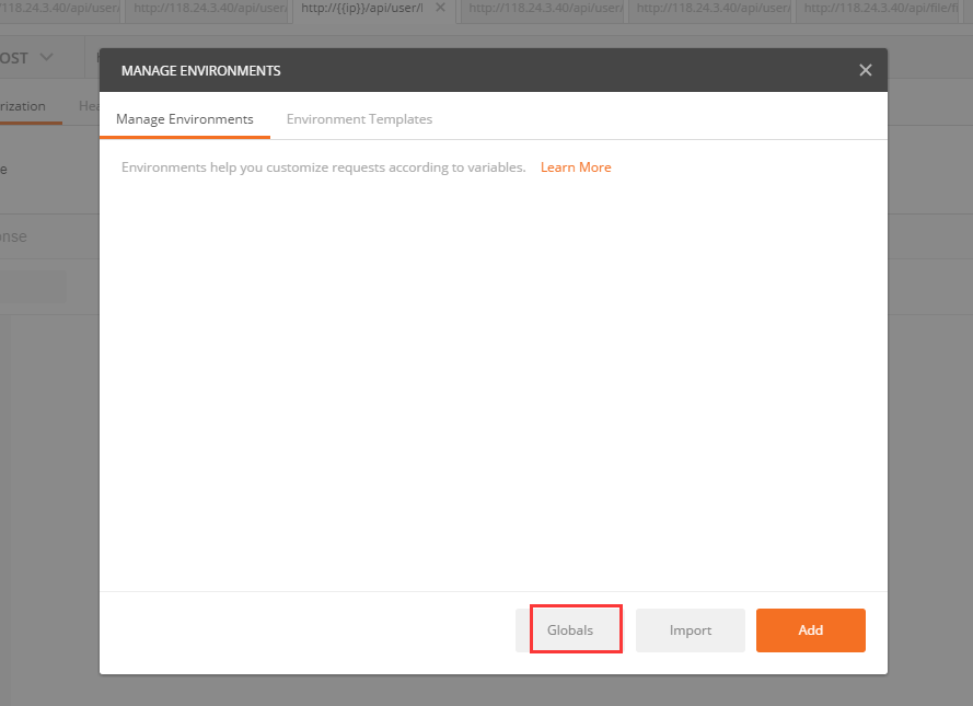 点击Manage Enviroments后便可以打开设置全局变量的对话框,然后点击右下方的Globals按钮,就是设置全局变量
