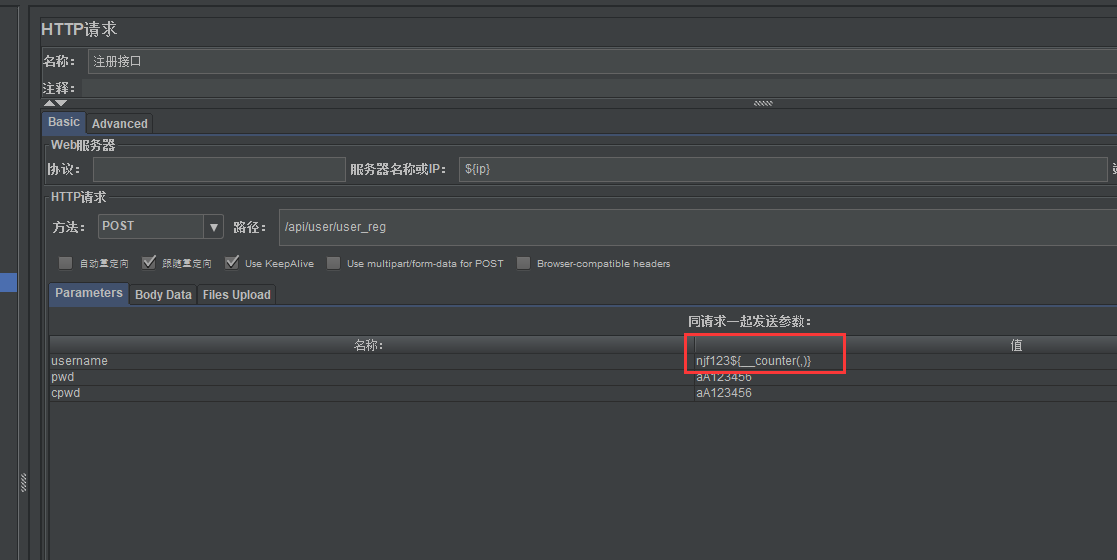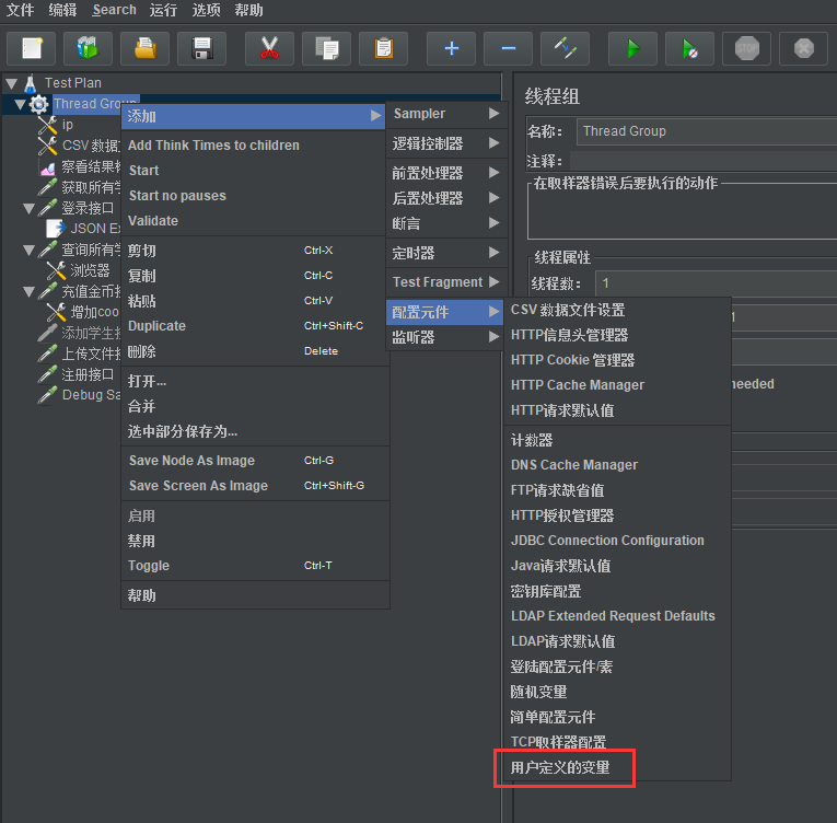 6)用户定义的变量,之前在新增接口用例时,ip一栏可以直接输入地址也可以使用自定义变量,自定义变量的添加也存在层级关系,在线程组添加的,这个变量就适用于该线程组下所有的接口请求