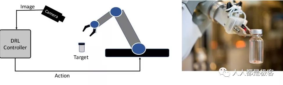深度强化学习(DRL)对于在复杂动态环境中运行的自适应控制系统是有好处的。 考虑控制在仓库操作中部署的机器人, 这些机器人必须动态地适应新的任务。 以强化学习为基础的控制者学习一项任务时, 它们通过执行一个动作, 使他们更接近目标而获得的奖励。例如, 控制器接收来自摄像机的图像, 该照片显示了机器人手臂的当前位置, 并利用图像中的信息来学习如何将手臂移近目标(图6)[3]。 基于DLC的控制器可以通过机器人模拟器或者通过观察实际的机器人来训练。