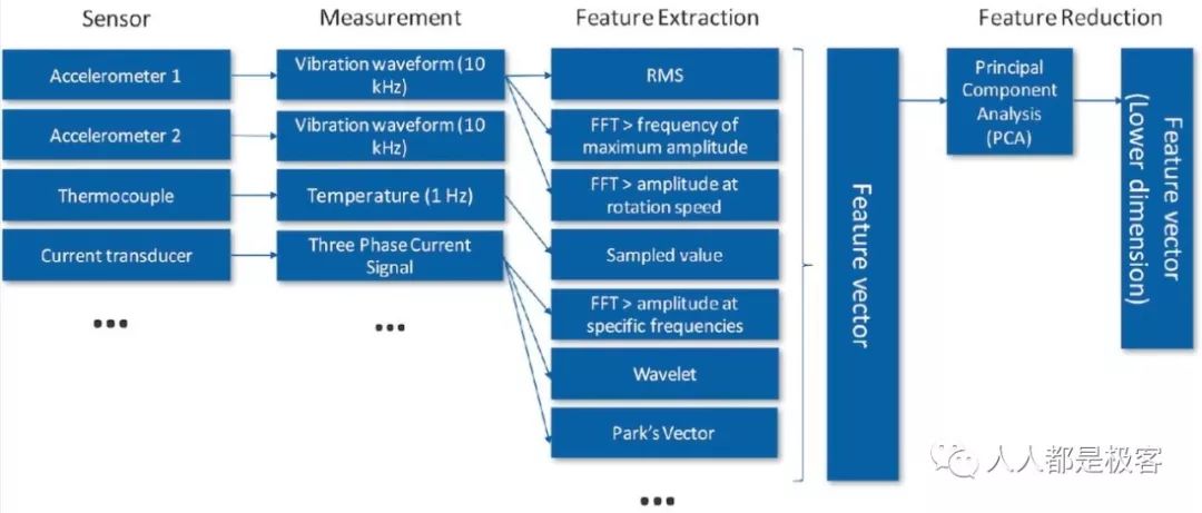 看看这个工作流程是如何用来监测电动机的健康状况的。数据是从多种类型的传感器收集的,例如加速度计,热电偶和连接到电机的电流传感器。特征工程步骤通常由两部分组成:特征提取和特征缩减(图2)。