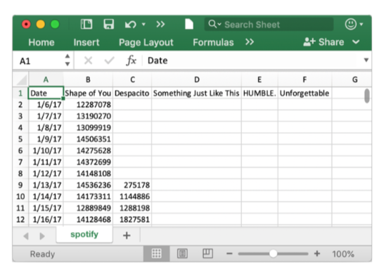 When we load the dataset, we want each entry in the first column to denote a different row. To do this, we set the value of index_col to the name of the first column ("Date", found in cell A1 of the file when it's opened in Excel).