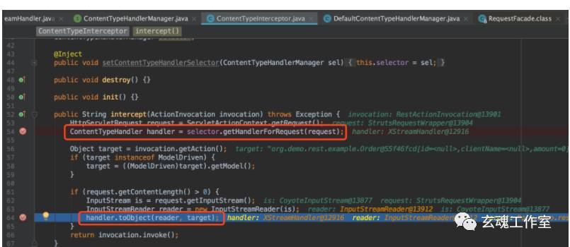 根据补丁分析, 构造相对应的漏洞检测数据包。使用调试工具分析,发现Action经过REST插件处理时会被ContentTypeInterceptor这个类拦截,进入intercept方法如下图所示: