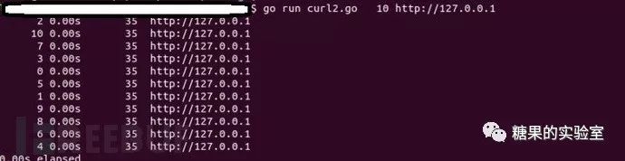 package mainimport ("fmt""io""io/ioutil""net/http""os""time""strconv")func main() {start := time.Now()ch := make(chan string)var count int64 = 1times,_ := strconv.ParseInt(os.Args[1],10,64)url := os.Args[2]for count = 0; count <= times; count++ {go fetch(url, ch, count) // start a goroutine}for count = 0; count <= times; count++ {fmt.Println(<-ch) // receive from channel ch}fmt.Printf("%.2fs elapsed\n", time.Since(start).Seconds())}func fetch(url string, ch chan<- string,count int64) {start := time.Now()resp, err := http.Get(url)if err != nil {ch <- fmt.Sprint(err) // send to channel chreturn}nbytes, err := io.Copy(ioutil.Discard, resp.Body)resp.Body.Close() // don't leak resourcesif err != nil {ch <- fmt.Sprintf("while reading %s: %v", url, err)return}secs := time.Since(start).Seconds()ch <- fmt.Sprintf("%7d %.2fs %7d %s",count, secs, nbytes,url)}
