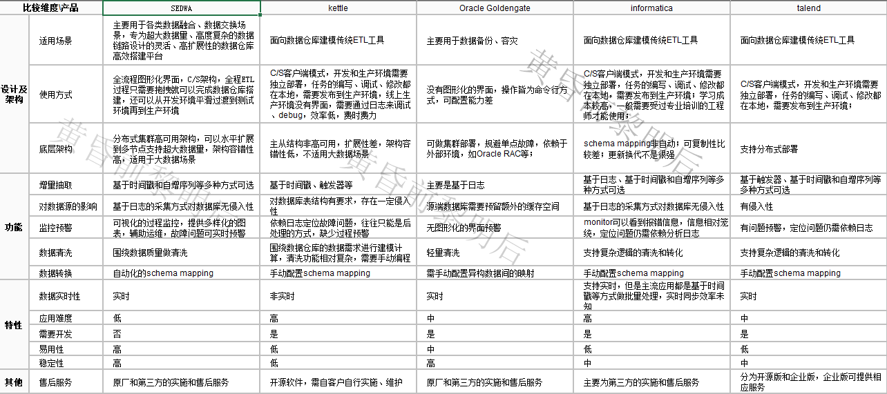 ETL过程我们简单介绍了一下,接下来我们来了解市面上数据仓库解决方案。以下五种ETL工具是我基本接触过的产品,个人根据产品对应官网以及提供的资料总结,对比的五种ETL工具(SEDWA、kettle、OracleGoldengate、informatica、talend)的比较,目前对于这些工具也是初步了解,后续根据实际的体验学习后再来进一步总结丰富对比维度信息。注意工具排名不分先后,个人认为技术没有绝对的好坏,关键是看大家使用的场景。实际工作中选购满足公司需要的产品即可。