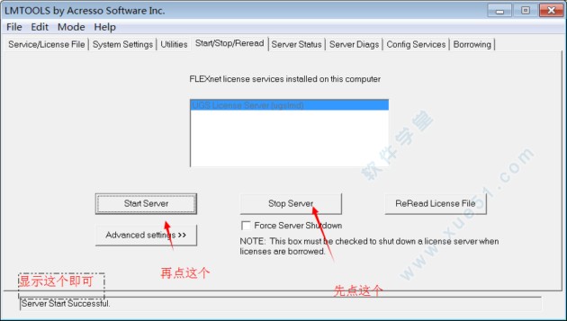 返回“start/stop/reread”,选中UGS License Server (ugslmd),先点击“stop server”再点击“start server”启动,可以看到“server start successful”。