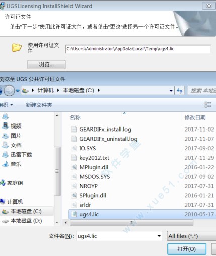 5、接着下一步等步骤小编就不贴出来了,直到使用许可证文件,这里选择之前在c盘根目录下的ugs4.lic。