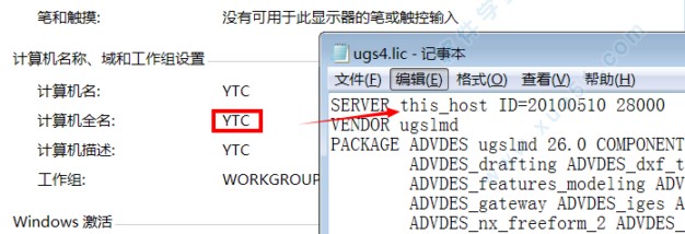 2、用记事本打开ugs4.lic,用你的计算机名替换this name,然后保存,计算机名右键-计算机-属性即可查看(注意:计算机名也不能带有中文)