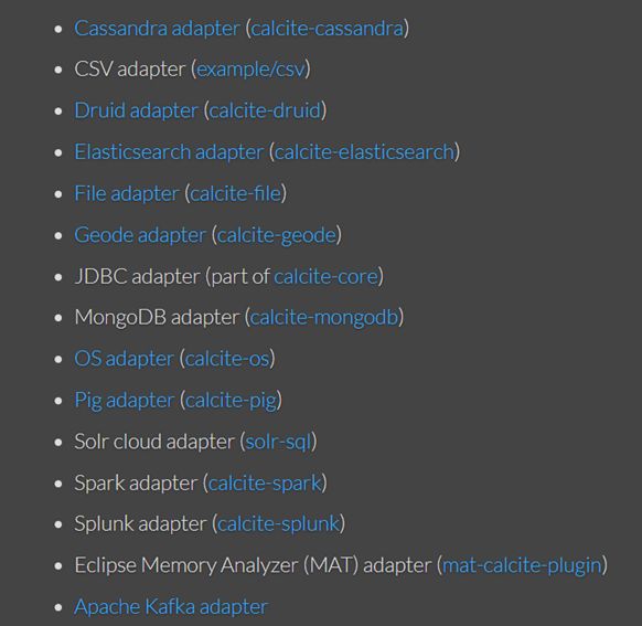Calcite本身已经实现了很多的适配器,当然我们也可以自己开发新的数据处理引擎对应的适配器。下图是calcite内置的适配器。