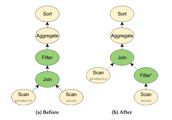 因为where子句仅仅用于sales表,我们可以把filter挪到join之前如右半部分图所示。这个优化可以大幅减少执行时间。另外,如果这两张表不在同一个backend中,这个优化能使适配器把filter下推到backend中。这个优化就是calcite的FilterIntoJoinRule。