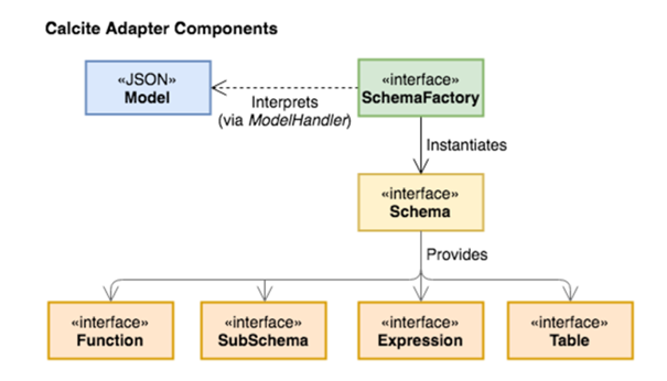 适配器由model、schema以及schema factory组成。Model是数据源的物理属性的规范。Schema是model中的数据的定义(主要是格式和布局)。数据本身可以通过table访问。Calcite使用适配层中定义的table接口访问数据。适配器可以定义一系列的规则并添加到planner中。例如,他可以添加以下规则:把逻辑关系表达式转化为这个适配层对应的引擎的关系表达式。Schema factory从model中获取元数据信息并生成schema。