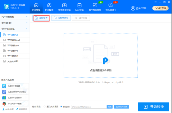 第四步:点击右侧空白处上方的“添加文件”,将需要转换格式的wps文件给添加进来。