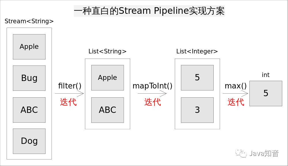 采用这种方式我们不但减少了迭代次数,也避免了存储中间结果,显然这就是流水线,因为我们把三个操作放在了一次迭代当中。只要我们事先知道用户意图,总是能够采用上述方式实现跟Stream API等价的功能,但问题是Stream类库的设计者并不知道用户的意图是什么。如何在无法假设用户行为的前提下实现流水线,是类库的设计者要考虑的问题。