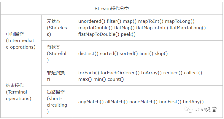 Stream上的所有操作分为两类:中间操作和结束操作,中间操作只是一种标记,只有结束操作才会触发实际计算。中间操作又可以分为无状态的(Stateless)和有状态的(Stateful),无状态中间操作是指元素的处理不受前面元素的影响,而有状态的中间操作必须等到所有元素处理之后才知道最终结果,比如排序是有状态操作,在读取所有元素之前并不能确定排序结果;结束操作又可以分为短路操作和非短路操作,短路操作是指不用处理全部元素就可以返回结果,比如找到第一个满足条件的元素。之所以要进行如此精细的划分,是因为底层对每一种情况的处理方式不同。
