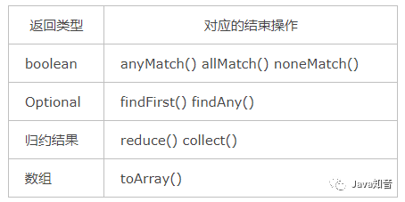 回到流水线执行结果的问题上来,需要返回结果的流水线结果存在哪里呢?这要分不同的情况讨论,下表给出了各种有返回结果的Stream结束操作。