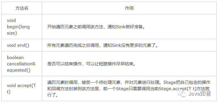 比如Stream.sorted()是一个有状态的中间操作,其对应的Sink.begin()方法可能创建一个乘放结果的容器,而accept()方法负责将元素添加到该容器,最后end()负责对容器进行排序。对于短路操作,Sink.cancellationRequested()也是必须实现的,比如Stream.findFirst()是短路操作,只要找到一个元素,cancellationRequested()就应该返回true,以便调用者尽快结束查找。Sink的四个接口方法常常相互协作,共同完成计算任务。实际上Stream API内部实现的的本质,就是如何重载Sink的这四个接口方法。(Java知音公众号回复“面试题聚合”,送你一份Java面试题宝典)