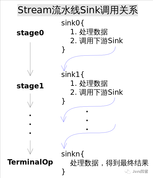 结束操作之后不能再有别的操作,所以结束操作不会创建新的流水线阶段(Stage),直观的说就是流水线的链表不会在往后延伸了。结束操作会创建一个包装了自己操作的Sink,这也是流水线中最后一个Sink,这个Sink只需要处理数据而不需要将结果传递给下游的Sink(因为没有下游)。对于Sink的[处理->转发]模型,结束操作的Sink就是调用链的出口。