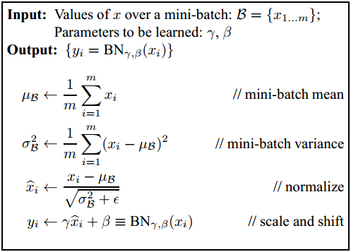 加入缩放和平移变量γ和β ,归一化后的值,y=γx’+β