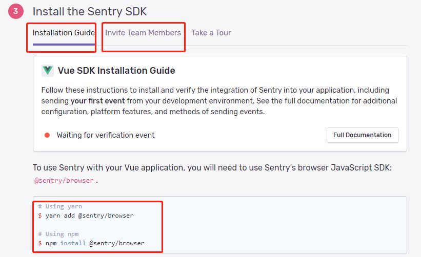 按照上图指示,在项目目录下安装:@sentry/browser 和 @sentry/integrations: