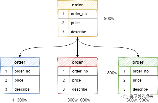 例如:一张 order 订单表有 900万数据,经过水平拆分出来三个表,order_1、order_2、order_3,每张表存有数据 300万,以此类推。