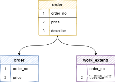 例如:一张 order 订单表,将订单金额、订单编号等访问频繁的字段,单独拆成一张表,把 blob 类型这样的大字段或访问不频繁的字段,拆分出来创建一个单独的扩展表 work_extend ,这样每张表只存储原表的一部分字段,再将拆分出来的表分散到不同的库中。
