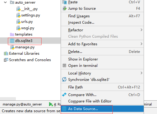 注意:sqlite3 为文件数据库,数据库实体本身就在django项目目录内,直接右键作为数据源打开即可。