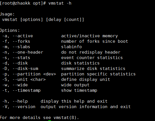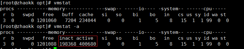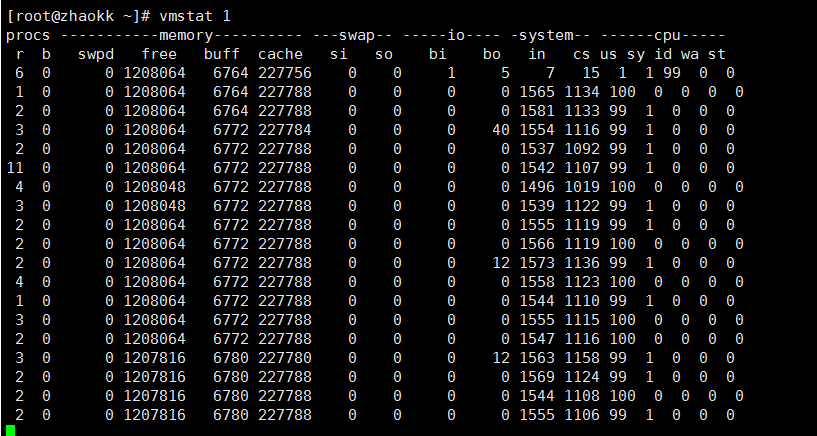 [root@zhaokk opt]# vmstatprocs -----------memory---------- ---swap-- -----io---- -system-- ------cpu-----r b swpd free buff cache si so bi bo in cs us sy id wa st3 0 0 1201060 7204 234044 0 0 1 5 8 15 1 1 99 0 0