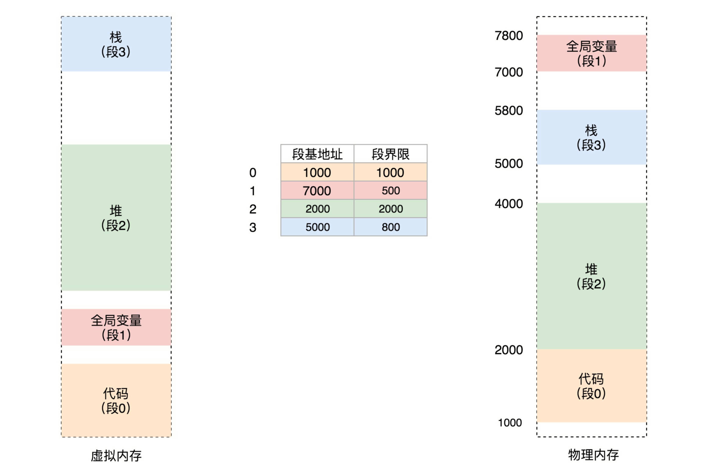 例如,我们将上面的虚拟空间分成以下 4 个段,用 0~3 来编号。每个段在段表中有一个项,在物理空间中,段的排列如下图的右边所示。