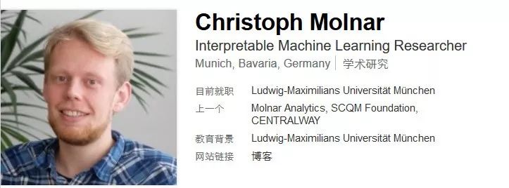 这本书的作者是 Christoph Molnar,是路德维希马克西米利安慕尼黑大学的PHD,有着多年的数据分析、自动化以及机器学习的工作经验,现在致力于将机器学习模型可解释。