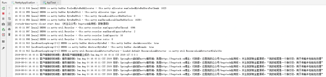 2019-08-04 16:40:11.952 INFO 9160 --- [ntLoopGroup-3-1] o.i.demo.netty.server.MyServerHandler : 2019-08-04 16:40:11 服务端接收到消息:你好,SpringBoot启动的netty服务端,我是https://bugstack.cn博主,付政委。这是我的公众号<bugstack虫洞栈>,关注我获取全套源码。“我的结尾是一个换行符,用于传输半包粘包处理”