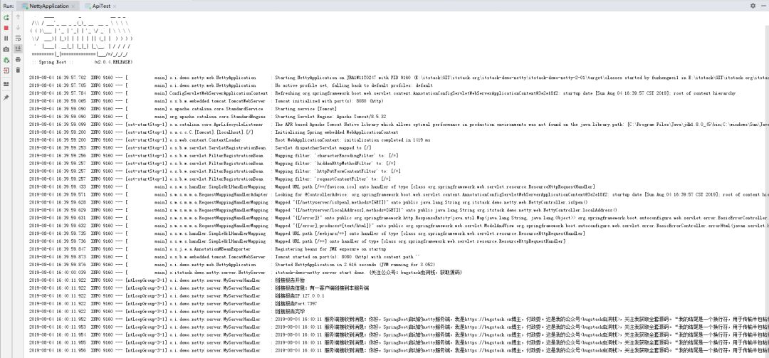 2019-08-04 16:40:00.039 INFO 9160 --- [ main] o.itstack.demo.netty.server.NettyServer : itstack-demo-netty server start done. {关注公众号:bugstack虫洞栈,获取源码}