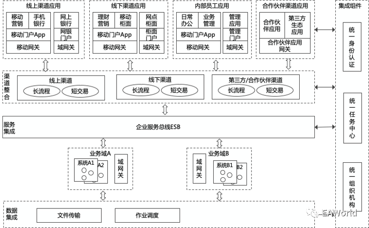 所谓集成就是要做整合,从业务使用视角和实施运维的视角看,相关集成组件一般有页面集成、流程集成、服务集成、数据集成和一些其他公共的集成所需组件,例如统一身份认证、统一应用门户框架、统一任务中心、统一组织机构用户、统一流程集成、服务集成、批量文件传输、作业调度等等。