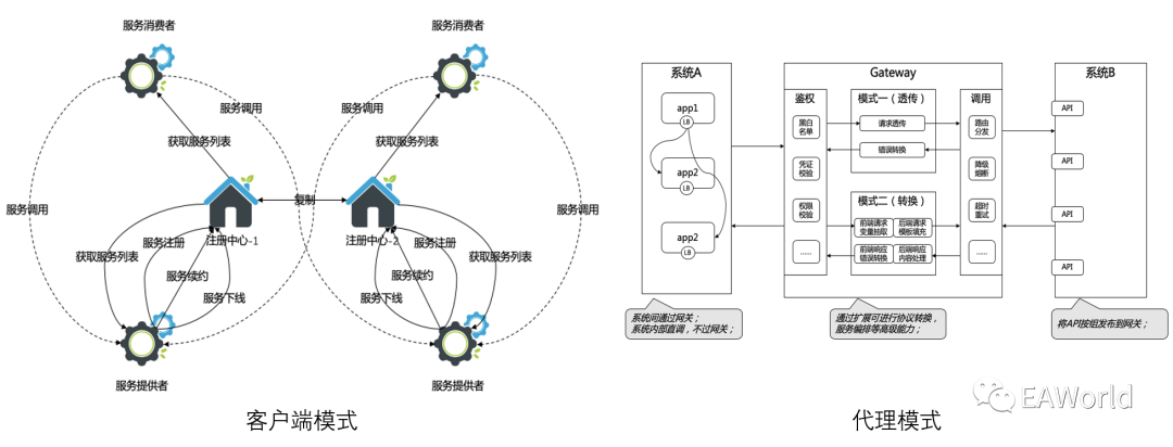 在代理模式下,“服务消费者”通过 API Gateway 组件与微服务、“服务注册中心”连接。“服务消费者”只管去找 API Gateway 访问即可。至于去注册中心查询服务地址,以及访问服务地址的动作都由 API Gateway 代劳了,最后 API Gateway 在把结果返回给“服务消费者”即可。