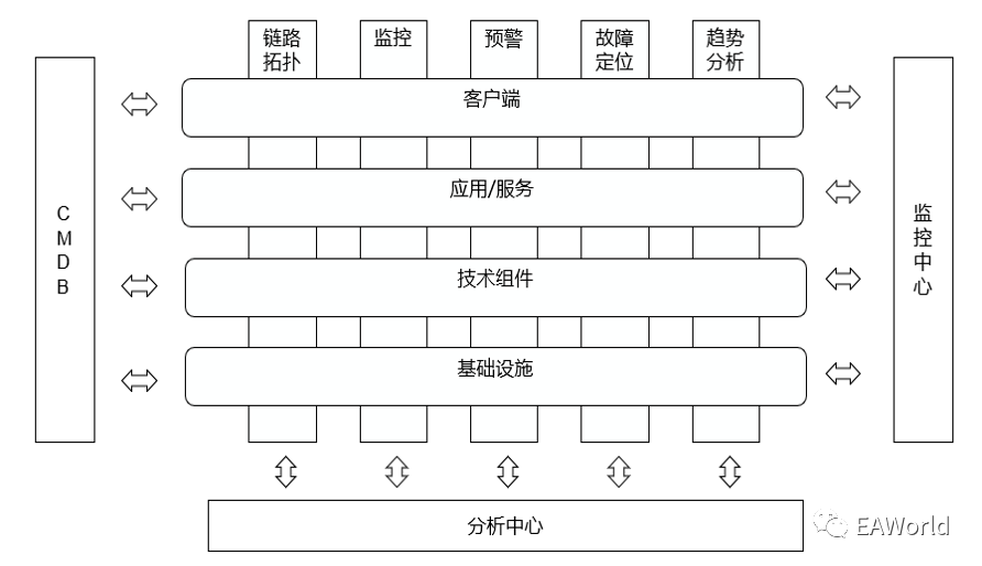 建立微服务架构下系统的知觉能力,需要多个层面配合完成,是一个系统性的工程,而不是孤立的考虑。我们把系统的“知觉”能力纵向分为四个层次,客户端(Web、H5、APP、小程序等)、服务端(微服务进程)、技术组件(虚机、容器、中间件、数据库等)、基础设施(网络、服务器、存储等)。“知觉”体现的最终行动,分为链路拓扑、监控、预警、故障定位、趋势分析等几个主题;配置中心(CMDB)实现所有涉及到的应用软件、系统软件、服务器和网络设备的配置管理、监控参数设置、业务规则配置,监控中心负责监控展示与告警;分析中心根据“感觉”采集的数据进行深度挖掘,积累知识。